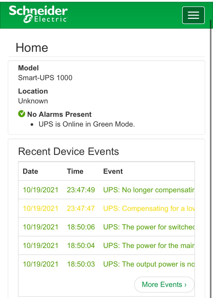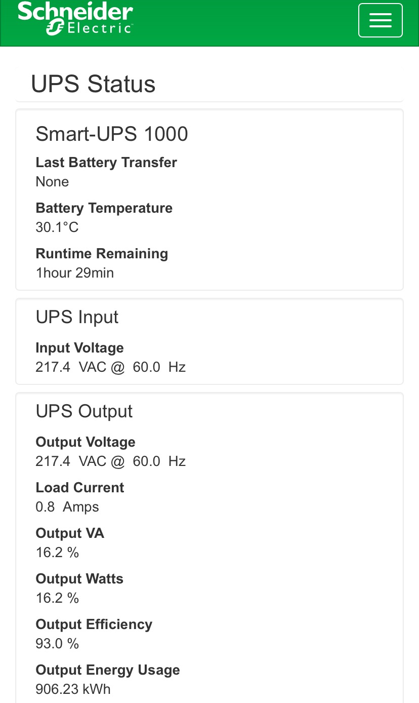 Status->UPS 에서 현제 로드/충전률을 확인 할 수 있으며 배터리 만료 기한까지 볼 수 있다.